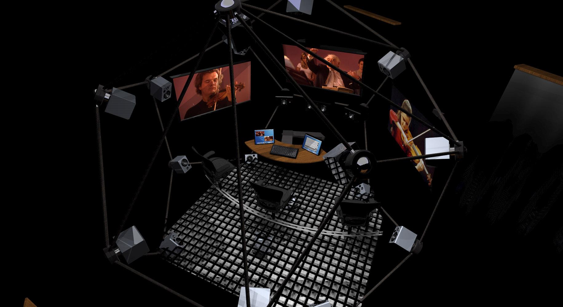 The system is not actually accurately represented by these images. The replay environment is a multichannel system for ambisonic and other surround sound replay as well as stereophony. The images depict loudspeakers that actually look like loudspeakers because this was a lot easier for clients to comprehend rather than the ones that were developed that looked rather like small spheres.
